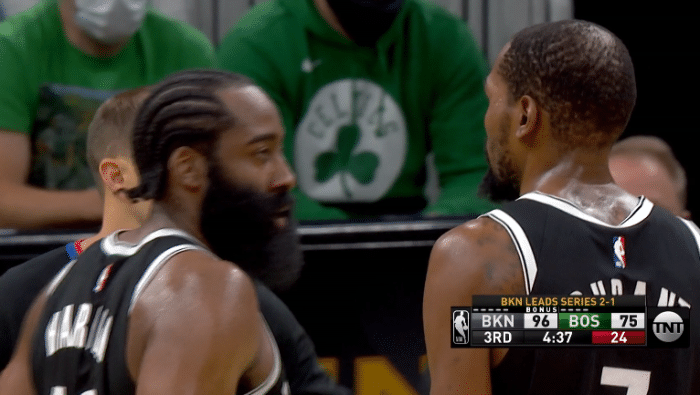 首节哈登仅仅出手一次,把精力放在组织进攻上;哈登不怎么得分,杜兰特和欧文单节合砍29分打疯了,尤其是杜兰特,不讲理突破滑翔暴扣以及各种死神式投篮,单节17分亮出死神镰刀。