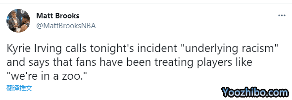 接受采访时,欧文回应被扔水瓶事件,他表示今晚的事件是潜在的种族主义,并表示球迷对待球员就像“我们在动物园里,把我们当成动物对待;欧文还表示是很多球员都遭遇这样的挑衅。
