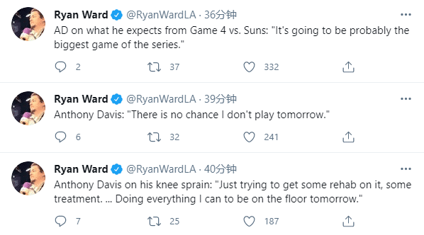 谈到自己的膝盖扭伤,浓眉表示:我会做一些康复治疗,尽我所能,我不可能缺席明天的比赛;明天我不可能缺席的,G4是系列赛最重要的一场,2-2还是3-1差别很大。