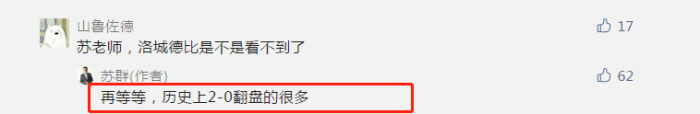 有球迷提问,“苏老师,洛城德比是不是看不到了”。而苏群回应,“再等等,历史上2-0翻盘的很多”。0-2和0-3落后,概念完全不一样,如果0-3落后的话,基本上可以判定出局了,就算是再强的球队,连赢4场的可能性也很小,难如登天。不过,快船0-2落后,也并非没有了晋级的希望,只要拿下G3,快船将大比分扳成1-2,就一切都有可能。