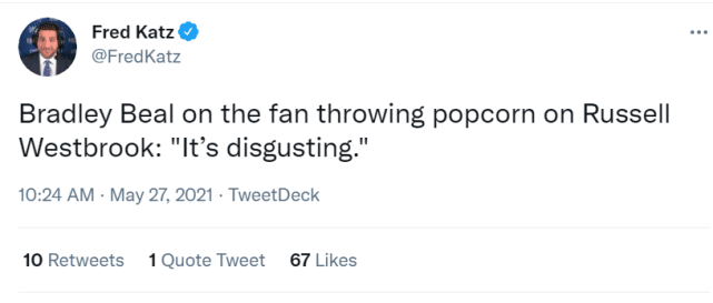 威少本人也回应了这件事。“人们可不敢在街上冲着我的脑袋扔爆米花,因为你知道接下来会发生什么……在这些球馆里,你得开始保护球员,我们拭目以待看看联盟怎么做。”
