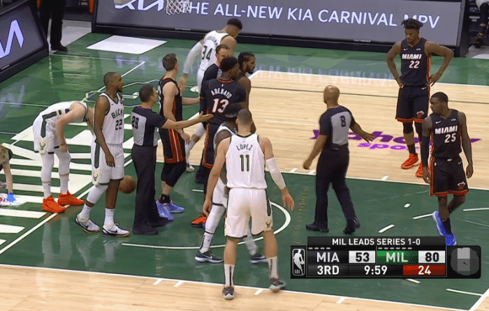 下半场的比赛开始后,字母哥突破上篮打中的同时, 阿里扎凶狠犯规,字母倒地,在起身的时候,阿里扎摁着字母哥的身体起来,这是一个很明显的挑衅动作,裁判来到技术台观看录像回放,在经过长时间的商量后,阿里扎一级恶意犯规,2+1,雄鹿并且有球权,随后纳恩在防守米德尔顿的时候再犯规,裁判经过录像回放后吹罚了,纳恩一级恶意犯规,三罚一掷,热火队的心态出现了崩盘,两队分差来到了32分,比赛基本已经失去了悬念。本场比赛的评论员巴克利在直播间谈到了两队,他表示雄鹿会以4:0横扫热火,热火无法击败雄鹿。