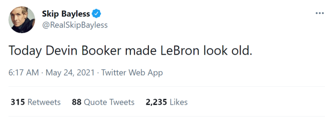 名嘴斯基普-贝勒斯赛后社媒上评价道:“今天的布克,让詹姆斯看上去老了。”毕竟,詹姆斯也36岁了。在年轻的布克面前,他有经验的优势,但岁月不饶人,体能上肯定不如比他小12岁的布克。