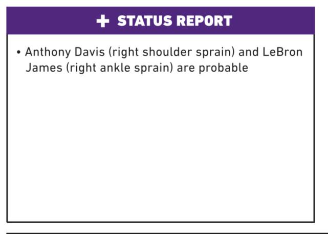 除了詹眉,湖人的其他球员都不在伤病名单上,意味着他们将铁定可以出场。美媒Lakers Daily列出了本赛季詹姆斯浓眉同场的数据。两人共同出战27场比赛,湖人19胜8负,两人同场的时间段,湖人百回合赢对手11.2分,表现还是相当不错的。