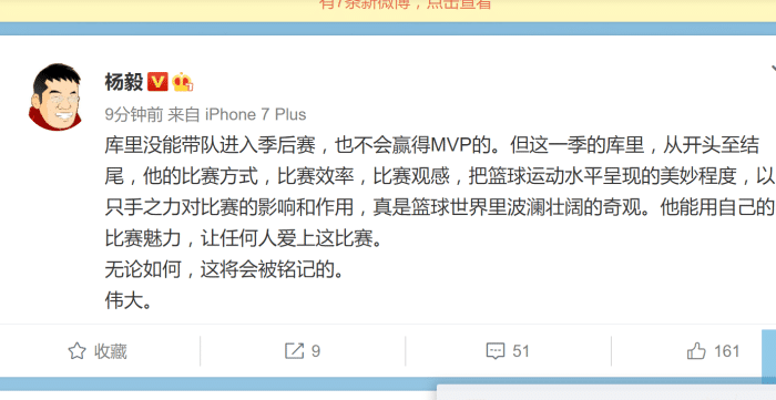 作为一名历史级别的超级巨星,缺少库里的季后赛无疑会少了很多的精彩。但纵观整个赛季,库里的表现仍然值得称赞。赛后第一时间,名嘴杨毅老师发表了自己的看法:库里没能带队进入季后赛,也不会赢得MVP的。但这一季的库里,从开头至结尾,他的比赛方式,比赛效率,比赛观感,把篮球运动水平呈现的美妙程度,以只手之力对比赛的影响和作用,真是篮球世界里波澜壮阔的奇观。他能用自己的比赛魅力,让任何人爱上这比赛。无论如何,这将会被铭记的。伟大。