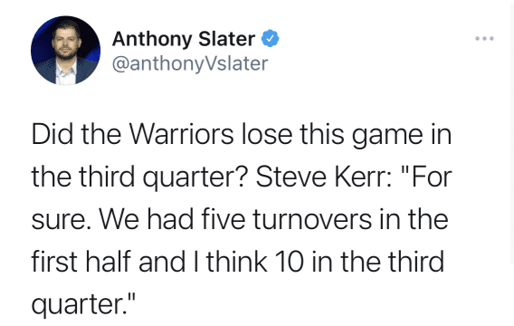 比赛结束之后,勇士主帅科尔也表达了自己的不满,他指出了球队输球的原因,就是在第三节频繁失误是最关键的原因之一,同时科尔直言:“这本应是属于我们的比赛,但我们没能拿下。”