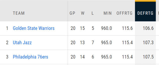 数据显示,赛季最后20场比赛,勇士的防守效率达到106.6,高居联盟同期第一。这也是为什么勇士能在最后20场比赛取得15胜5负战绩的一个重要原因。论最后20场比赛的胜率,他们比最终排名联盟第一的爵士(13胜7负)还要高。湖人最后20场比赛的防守效率排在联盟第七,也算不错。