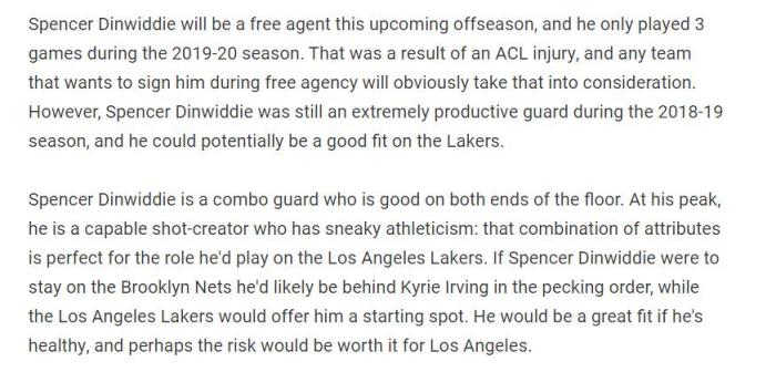 美国媒体《fadeawayworld》专栏作家Lee Tran就撰文分析,建议湖人全力追逐篮网后卫丁威迪,他可以担任詹姆斯之外的第2持球点。
