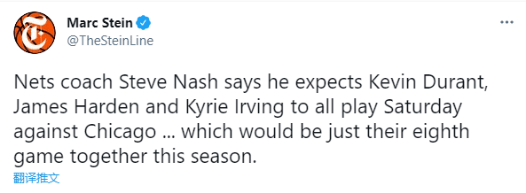 来源:24直播网05-15 17:5724直播网讯 北京时间5月15日,篮网三巨头终于又有合体了,据名记Marc Stein报道,篮网主帅纳什透露,预计杜兰特、欧文和哈登都会出战周日对阵公牛的比赛,三巨头再次联手,完全体篮网又要来了,这将是三巨头本赛季第8次同时上场。