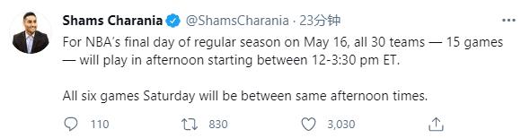 5月16日,常规赛倒数第二天,将会有6场比赛,这6场比赛的开球时间同样在16日北京时间凌晨0点-3点30分。有公牛篮网、湖人步行者、热火雄鹿这样的焦点比赛!但5月17日,常规赛最后一个比赛日更加可怕,30支球队均有比赛任务,依旧是统一在凌晨0点-3点30分进行开球比赛!