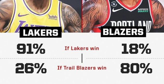 西部第六关键卡位战,湖人不敌开拓者,不仅丢掉西部第六的位置,而且仅仅落后开拓者1个胜场;目前他们仅有26%的概率直接进入季后赛,大概率要打附加赛。
