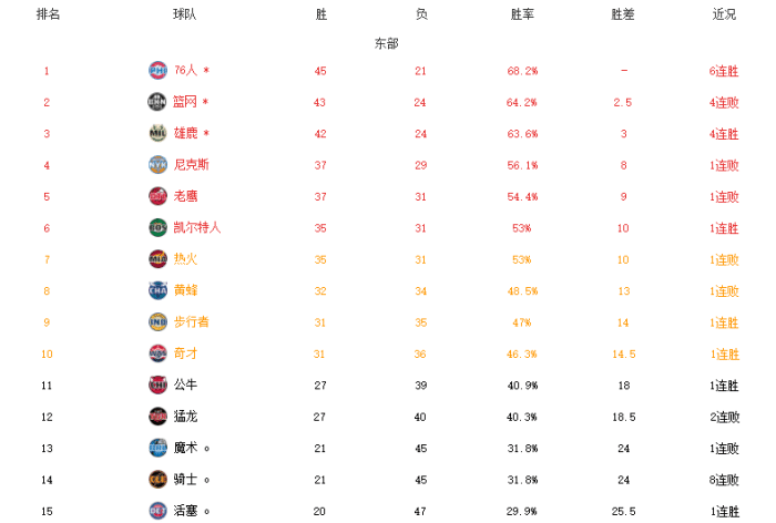 东部1-8名:费城、篮网、雄鹿、尼克斯、老鹰、凯尔特人、热火、黄蜂;