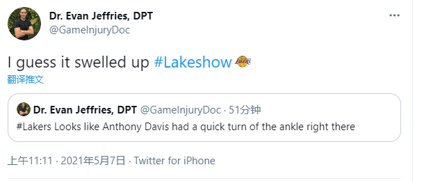 浓眉受伤返回更衣室接受治疗,期间医学专家Evan Jsffries发推写道:我猜浓眉的脚踝已经肿了。