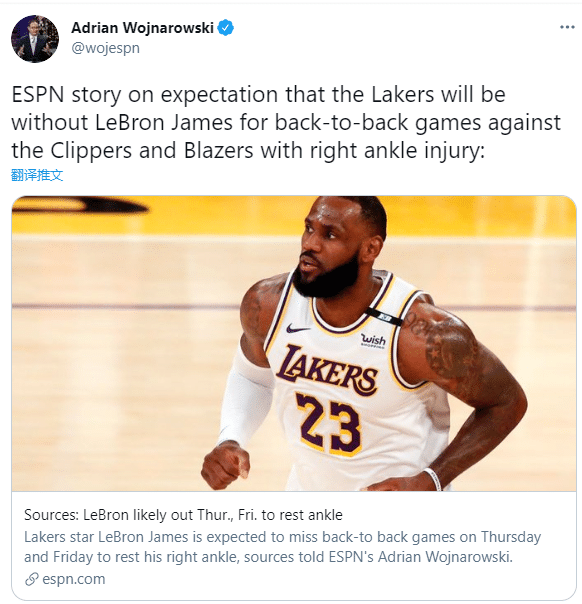 来源:24直播网05-05 20:1224直播网讯北京时间5月5日,ESPN名记沃纳罗斯基报道,预计詹姆斯将会因右脚踝伤势再缺席两场比赛,缺席对阵快船和开拓者的背靠背比赛,从而继续休养右脚踝;名记还表示随着季后赛临近,湖人谨慎对待詹姆斯的脚踝伤病,甚至爆料詹姆斯可能会缺席更多的比赛。