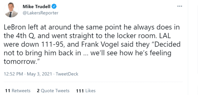 詹姆斯已经36岁了,而且季后赛就在眼前。沃格尔不得不更加谨慎对待詹姆斯的伤病。更何况换下詹姆斯的那个时刻,湖人已经落后猛龙16分,翻盘基本无望。