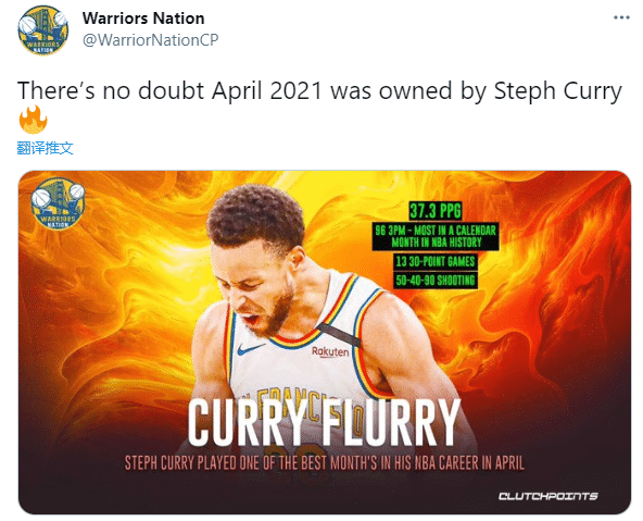 勇士媒体Warriors Nation发推写道:毫无疑问,2021年的4月份归库里所有。