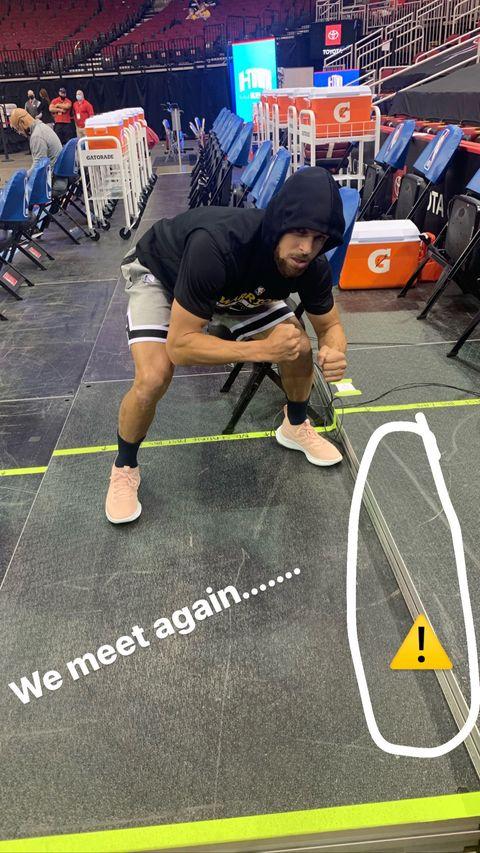 库里疯狂输出之前遭遇尾椎骨受伤,当时就是对阵火箭不幸受伤,伤停5场重返球场,打出史诗级的表现;今天再次来到休斯敦丰田中心球馆,赛前库里晒自己和场边金属台阶合影,双手紧握拳头,并且写道:我们又见面了。