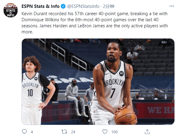 第三、杜兰特职业生涯第57次单场40+,追平威尔金斯,成为NBA近40年并列第六人;也是现役第三多,现役只有哈登(101次)和詹姆斯(66次)单场40+次数超过杜兰特。