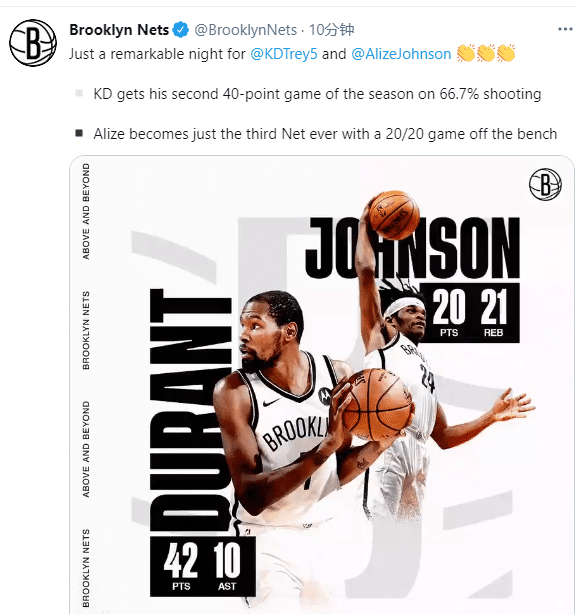 赢球后,篮网官方第一时间盛赞两大功臣,发推写道:今晚对他俩来说太重要,伟大的胜利;杜兰特42+10是一大功臣,另一功臣是阿利兹-约翰逊,替补轰下20分21篮板创纪录,纳什直呼约翰逊的数据令人难以置信。