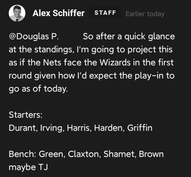 Schiffer预测篮网可能使用10人轮换。首发是:杜兰特、欧文、哈里斯、哈登和格里芬,替补是格林、克拉克斯顿、沙梅特、布朗,可能还有泰勒-约翰逊。