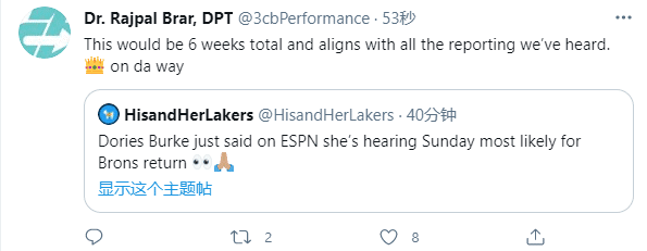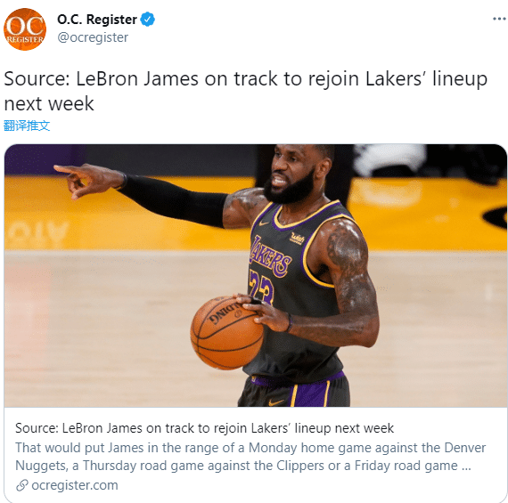 据报道,詹姆斯脚踝伤势康复很好,他有望在一周内重返湖人阵容;接下来湖人的对手依次是国王猛龙掘金快船开拓者;还有消息爆料,詹姆斯最有可能在下周一对阵猛龙时伤愈复出,医学专家Rajpal Brar转发这一消息,并且写道:刚好是六周,这和我们看到的伤病报告相吻合,詹姆斯在复出的路上。
