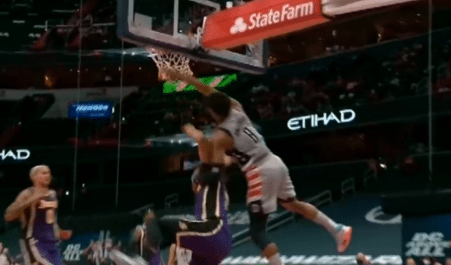 这是第三节还剩下8分52秒的时候,施罗德的三分球没有投进,比尔摘板之后长传前场快下的八村塁,八村塁迎着浓眉哥的防守,直接单臂抡圆了隔扣,也直接扣倒了浓眉哥,导致后者倒地。浓眉哥起初没有起身,因为他的鼻子被碰到了,之后才在队友的搀扶下起来了,湖人也进行暂停,让浓眉哥稍微调整下。