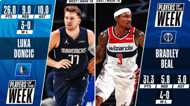 来源:24直播网04-27 15:2224直播网讯 北京时间4月27日,NBA官方公布了上周东西部周最佳球员。东部周最佳属于奇才后卫布拉德利-比尔,而西部周最佳属于独行侠后卫卢卡-东契奇。勇士队的库里虽然也有出色的表现,但无缘蝉联这一奖项。