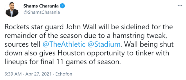 来源:24直播网04-27 15:2124直播网讯 北京时间4月27日,据名记查拉尼亚报道,火箭后卫约翰-沃尔因腿筋拉伤将缺席本赛季余下的所有比赛。火箭已经提前无缘季后赛,沃尔这时候被安排“赛季报销”,显然也是球队为了试验新阵容,当然,也得继续摆烂,确保能以倒数前三的成绩结束本赛季。随后,名记麦克马洪跟进报道,沃尔遭遇腿筋二级拉伤。