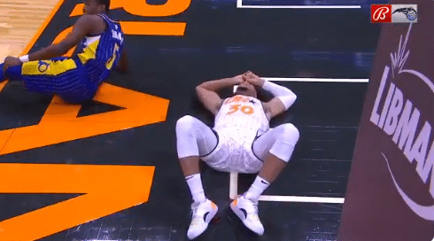 首节比赛,德文-坎纳迪在一次回防当中落地时受伤,明显的右腿受伤,痛苦倒地;地板上甚至出现了血迹,班巴一脸担忧,随后德文-坎纳迪被担架抬离球场,现场球迷以及两队球员和教练组都为他鼓掌祈祷,离场时德文-坎纳迪忍痛向球迷致敬,举手向球迷示意,如此画面真是令人泪目。
