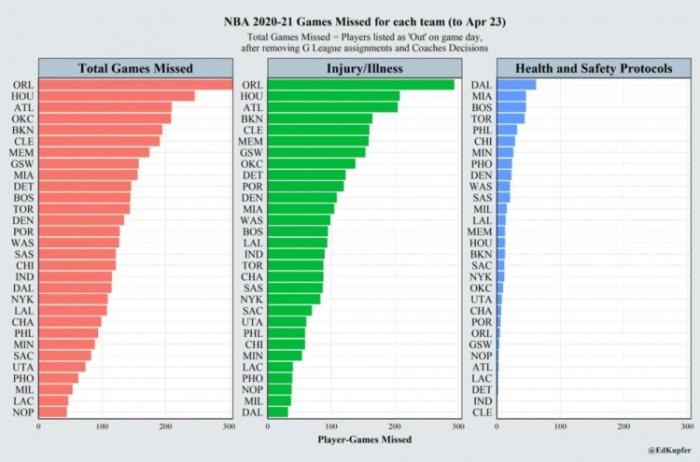 有美媒对本赛季至今的各支球队因伤病缺席人次的统计表,最左侧是总缺席人次,最右侧是因安全与健康协议缺席的人次,中间是因非健康与安全协议的伤病缺席人次。魔术和火箭是本赛季因伤病与健康协议缺阵人次最多的球队,篮网队第5,勇士队第8,湖人队第21,鹈鹕是伤缺人次最少的球队。