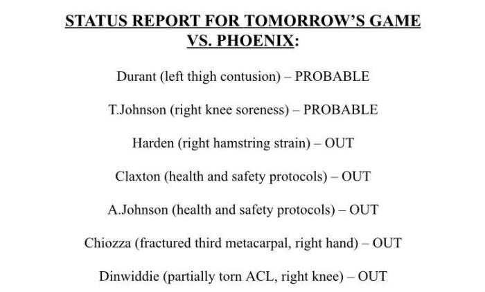 来源:24直播网04-25 16:3424直播网讯 布鲁克林篮网正式官宣下一场对阵太阳的伤病报告,哈登(右腿筋拉伤)、齐奥萨(右手骨折)、丁威迪(右膝伤势)以及克拉克斯顿和A-约翰逊五名球员继续缺席比赛,杜兰特(左大腿挫伤)和泰勒-约翰逊(右膝酸痛)出战状态再次升级,都被列为大概率出战。