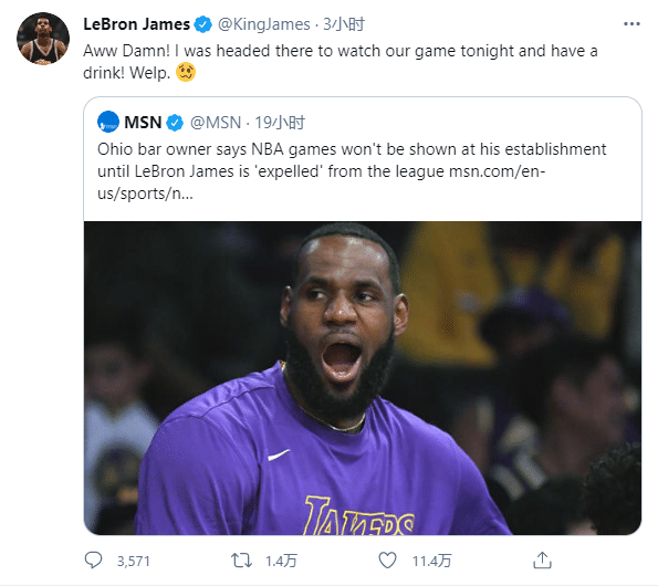 来源:24直播网04-25 16:3224直播网讯 此前俄亥俄州辛辛那提的酒吧老板呼吁联盟赶紧开除詹姆斯,否则就在酒吧内禁止播放NBA比赛;对此,湖人当家巨星勒布朗-詹姆斯已经公开回应酒店老板的言论;詹姆斯转发这一言论,发推写道:真该死!我本想今晚就去那里喝一杯,然后看我们的比赛呢!