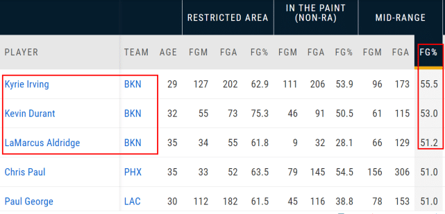 值得一提的是中投命中率前三的球员,竟然都来自同一支球队——布鲁克林篮网。排名第一的是欧文,173投96中,中投命中率达到55.5%,他也是至少出手100次中投的球员里唯一一位命中率超过55%的球员。让人眼花缭乱的控球能力,往往可以让欧文创造极佳的出手空间。