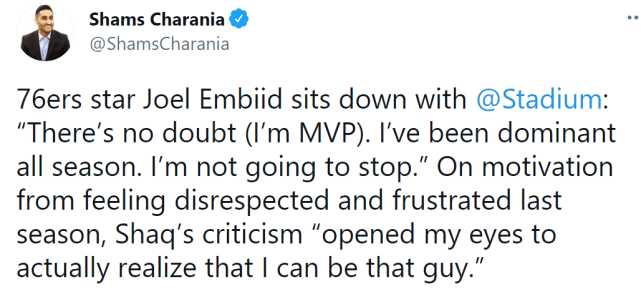 回应库里?恩比德直言自己才是今年MVP:我统治了一整个赛季