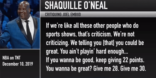 2019年12月10日,奥尼尔在电视节目上说道:“我们不是在批评(恩比德)。我们只是告诉你,你可以成就伟大。你只是还不够努力……如果你想变成一个好球员,那就继续一场拿22分吧。你想成为一个伟大的球员?那就去拿下28分,拿下30分!”
