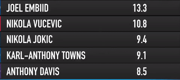 数据显示, 恩比德在背身单打场均得分方面排名联盟第一。他场均通过背身单打得到13.3分,而位列第二至五位的依次是武切维奇、约基奇、唐斯和浓眉。