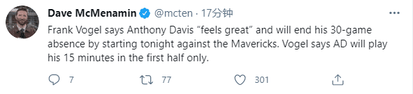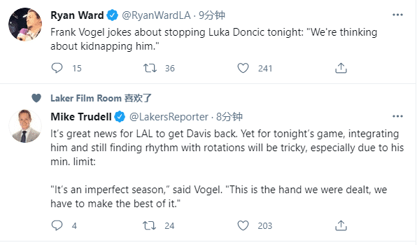 对于浓眉伤愈复出,湖人随队记者Mike Trudell发推写道:对于湖人来说这是一个好消息,然而浓眉复出首战,让他融入球队并且找到节奏是很难的;沃格尔表示这是一个不完美的赛季,我们要尽力而为。