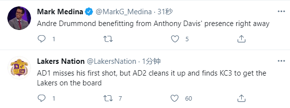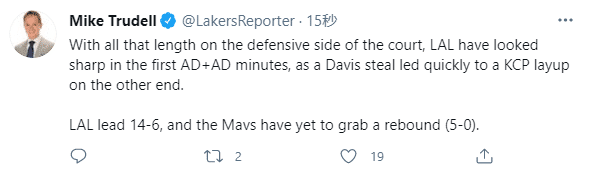 湖人开场打出进攻高潮,14-6攻势打停独行侠,期间湖人篮板5-0,其中有3个进攻篮板;湖人记者Mike Trudell发推写道:湖人在两个AD合体的第一分钟就显得十分犀利,浓眉抢断助波普反击上篮。