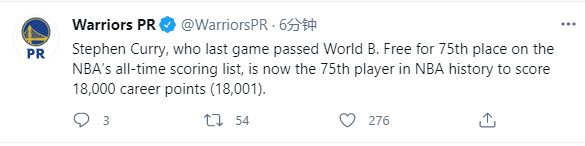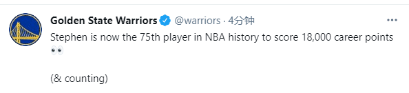 勇士官方第一时间恭喜库里解锁18000分里程碑,不久前,勇士球星维金斯也迎来里程碑时刻,成为NBA历史上第一位得分破万的加拿大球员。