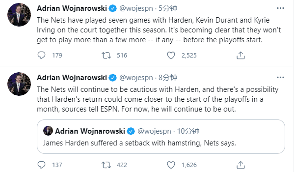 篮网会继续谨慎处理哈登的伤势,据espn名记沃纳罗斯基透露,哈登有可能季后赛才能复出,目前杜兰特、哈登和欧文三巨头仅仅只在一起打过7场比赛,现在看来,他们不会在一起打更多的比赛,如果有的话,也可能是季后赛之前。