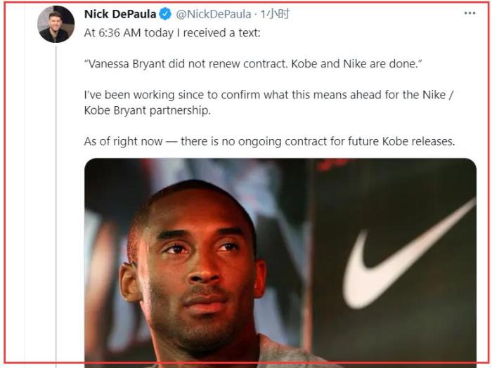 据记者Nick DePaula在社媒上写道:早上6点35分我收到一则消息,瓦妮莎布莱恩特没有续签合同,科比与耐克的合作结束了!我一直在努力确认这对于耐克和科比而言意味着什么。但截止目前,尚没有关于科比未来合同的版本!