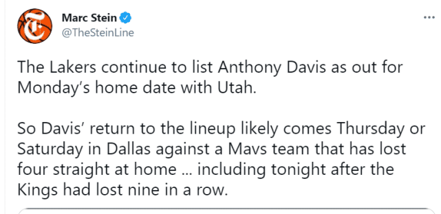 名记马克-斯坦恩转发官方伤病名单,写道:“对爵士一战,浓眉依然被湖人列为‘缺席‘的状态。所以,戴维斯很可能将在接下来两场客场对独行侠的比赛中复出。独行侠已经在主场遭遇4连败,包括在今天输给此前9连败的国王。”