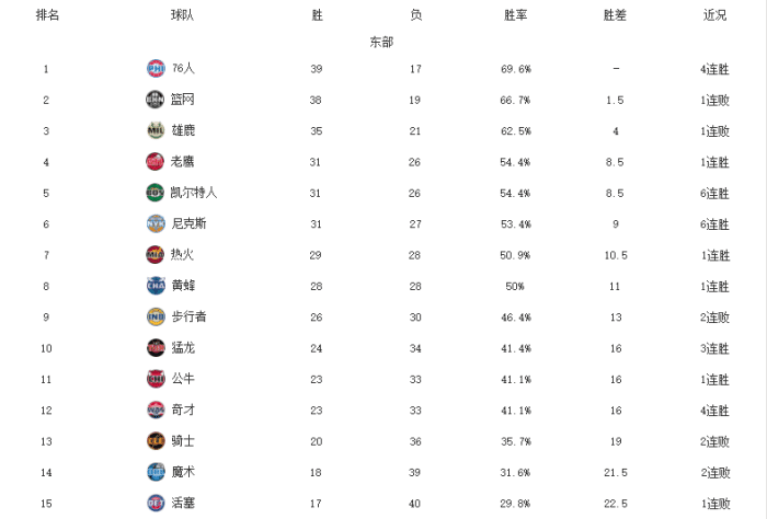 东部1-8名:费城、篮网、雄鹿、老鹰、凯尔特人、尼克斯、热火、黄蜂;