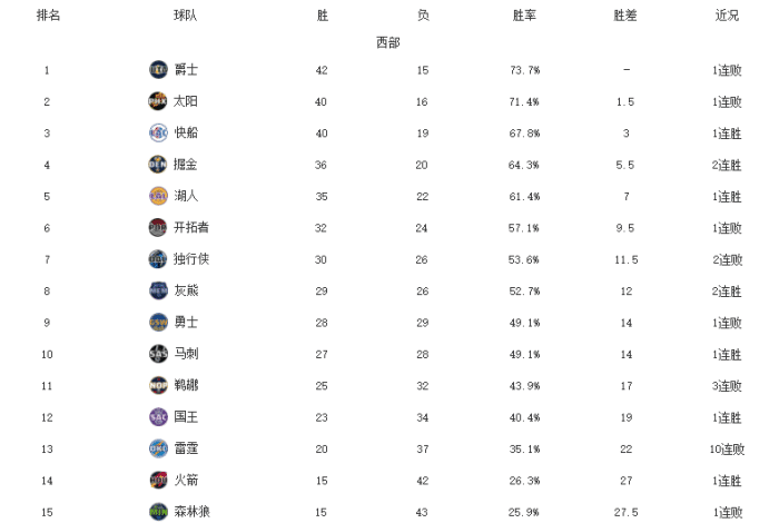 勇士昨天惜败给凯尔特人,库里轰进11记三分球却难救主。马刺的战绩是27胜28负,他们稳居前十名。鹈鹕今天输给尼克斯之后吃到3连败,距离季后赛附加赛的席位越来越远了。国王击败了独行侠,福克斯带队止住了近期的颓势。雷霆输给猛龙之后已经吃到了10连败,这也是他们来到俄城之后的第二长连败。火箭今天险胜魔术,成功摆脱了西部垫底的位置。森林狼输给快船,又回到了垫底的位置。