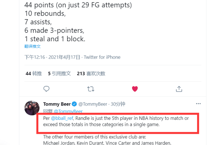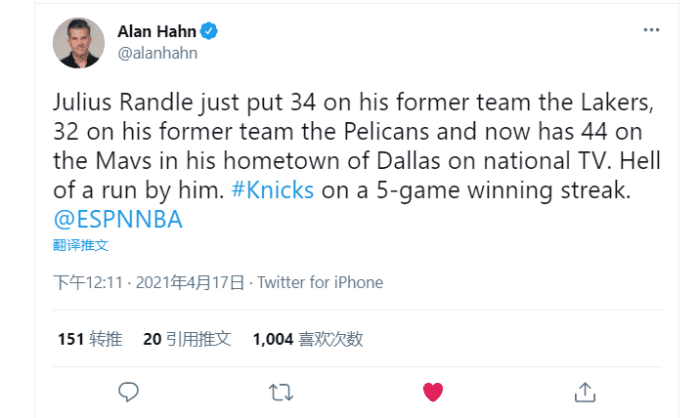记者alan hahn:最近3战,兰德尔在老东家湖人身上砍下34分,在老东家鹈鹕身上得到32分,今天又在全美直播中在自己的家乡达拉斯狂砍44分!