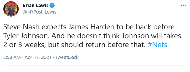跟队记者Billy Reinhardt指出,篮网在打完黄蜂后,将连续面对热火、鹈鹕和猛龙,其中鹈鹕和猛龙是背靠背的比赛。他预计哈登将在对猛龙的比赛中回归,也就是背靠背的第二场。篮网主帅纳什在采访中表示,哈登会在泰勒-约翰逊之前回归,而约翰逊预计不需要再等2-3周,会在这个时间之前回来。