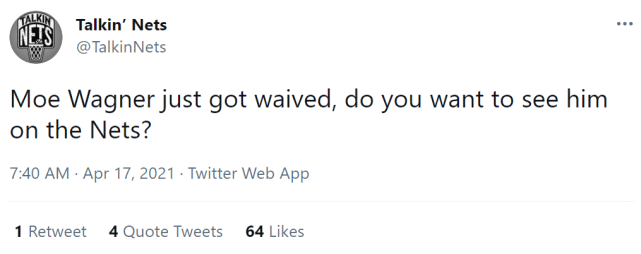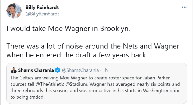时隔近三年,瓦格纳被凯尔特人裁掉,成为一名自由球员,失去阿德的篮网还想将他招致麾下吗?篮网球迷媒体Talkin'Nets也更新社媒写道:“莫-瓦格纳刚被裁掉,你想看到他加入篮网吗?”