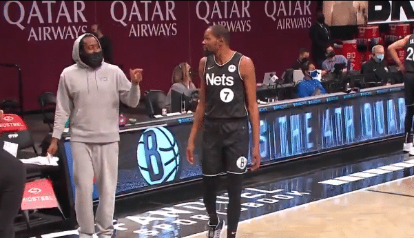 效仿詹眉?哈登杜兰特上演默剧,大胡子场边整蛊,KD连忙躲闪