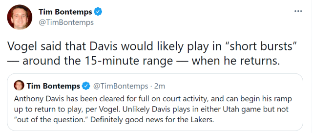 此前,美媒报道称浓眉在回到洛杉矶后会接受新的评估,预计还要缺席一周左右的时间,现在来看,浓眉的伤情没有出现反复,他确实接近复出了。当然,缺席了这么长时间,沃格尔也会谨慎对待浓眉的出场时间,预计一场先打15分钟左右。这确实是比较合理的安排,随着时间的进展,他们会逐步增加浓眉的出场时间。
