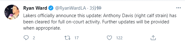 来源:24直播网04-16 14:5724直播网讯湖人巨头终于要复仇了,湖人对阵凯尔特人赛前,沃格尔透露安东尼-戴维斯已经获得参加球场完整训练的许可,这意味着浓眉小腿伤势已经痊愈,虽然接下来几场比赛,浓眉不太可能出战,但这是浓眉复出的重大利好;湖人也已官宣这个喜讯。